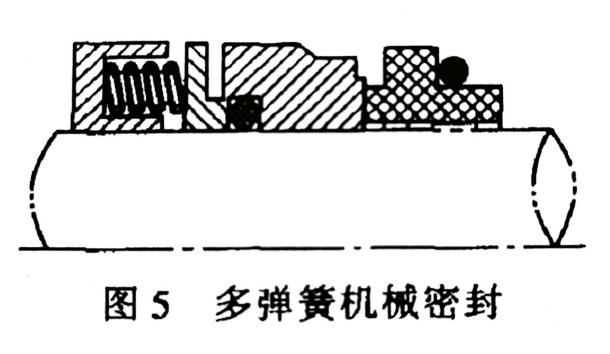 按補償結(jié)構(gòu)中彈簧的數(shù)量可分為多彈簧和單彈簧機械密封。補償結(jié)構(gòu)中有多個彈簧的密封稱為多彈簧機械密封(圖5);補償結(jié)構(gòu)中只有一個彈簧的機械密封稱為單彈簧機械密封(圖6)。多彈簧機械密封又稱小彈簧機械密封,這種結(jié)構(gòu)軸向長度較小,可用更改彈簧數(shù)量的辦法調(diào)節(jié)彈性力大小,軸向力較均勻,適用于高速機械密封,在腐蝕性介質(zhì)中不宜采用。單彈簧機械密封又稱大彈簧機械密封,密封結(jié)構(gòu)較為簡單。有的密封型式還用彈簧傳遞扭矩。國產(chǎn)密封應(yīng)用大彈簧較多,但不能用于高速。