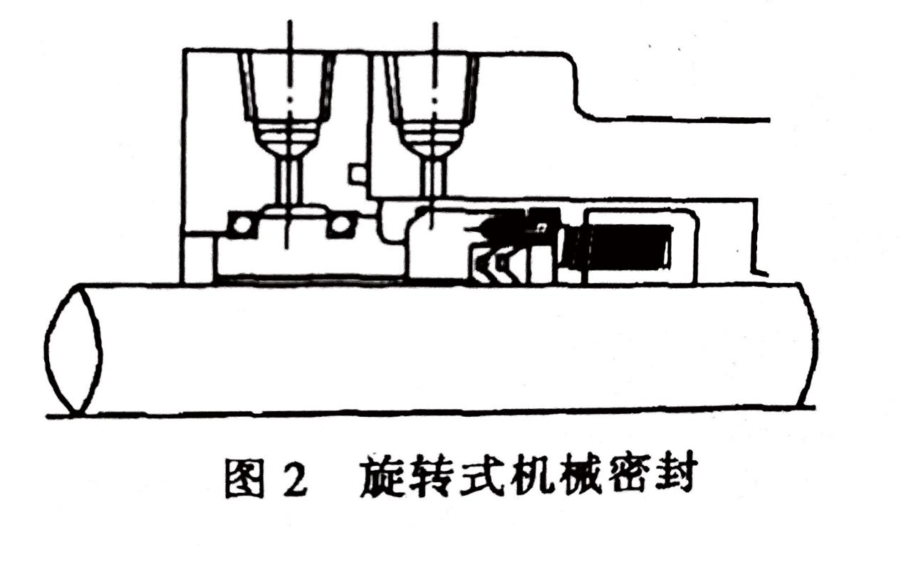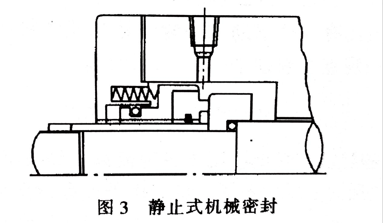 按補(bǔ)償結(jié)構(gòu)彈性元件的運(yùn)動(dòng)情況,可以分為旋轉(zhuǎn)式和靜止式機(jī)械密封。補(bǔ)償結(jié)構(gòu)隨軸旋轉(zhuǎn)的稱為旋轉(zhuǎn)式機(jī)械密封(圖2);補(bǔ)償結(jié)構(gòu)不旋轉(zhuǎn)的(安裝在壓蓋內(nèi))稱為靜止式機(jī)械密封(圖3)。補(bǔ)償結(jié)構(gòu)旋轉(zhuǎn)時(shí)易發(fā)生質(zhì)量不平衡,同時(shí)消耗攪拌功率,因此,旋轉(zhuǎn)式密封不能用于高速;而靜止式密封可用于高速。可是旋轉(zhuǎn)式密封安裝較方便,所以,普通的機(jī)械密封大多選用旋轉(zhuǎn)式結(jié)構(gòu)。
