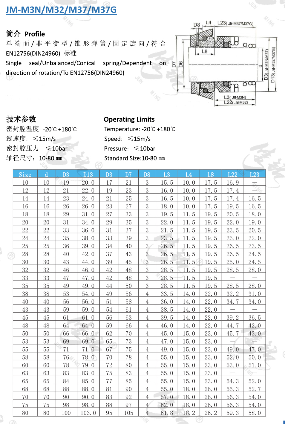 單端面/非平衡型/錐形彈簧/固定旋向/符合EN12756(DIN24960) 標(biāo)準(zhǔn)。