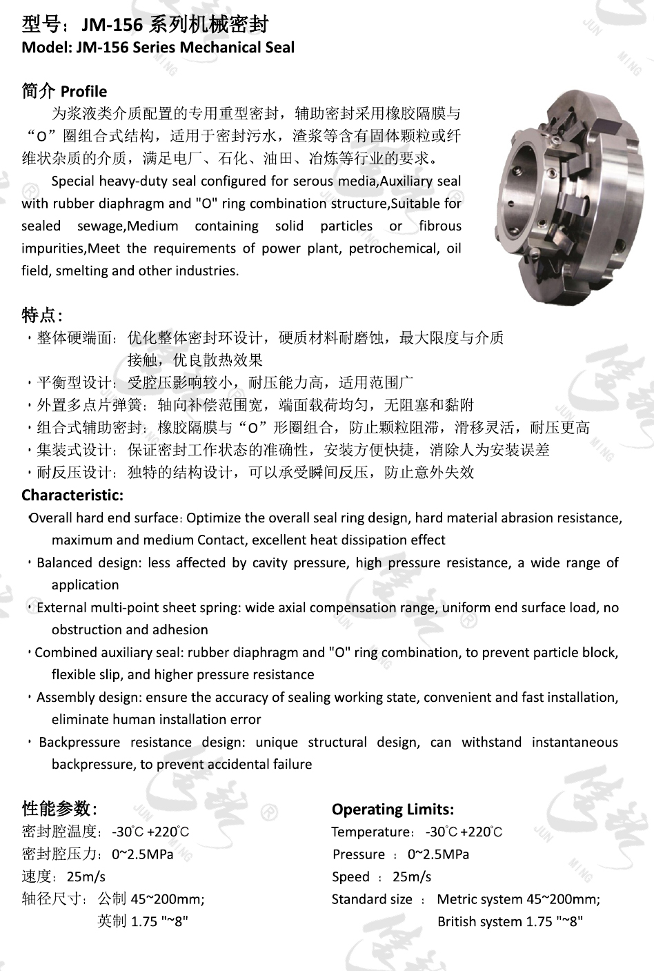 為漿液類介質(zhì)配置的專用重型密封,輔助密封采用橡膠隔膜與“O”圈組合式結(jié)構(gòu),適用于密封污水,渣漿等含有固體顆粒或纖維狀雜質(zhì)的介質(zhì),滿足電廠、石化、油田、冶煉等行業(yè)的要求。