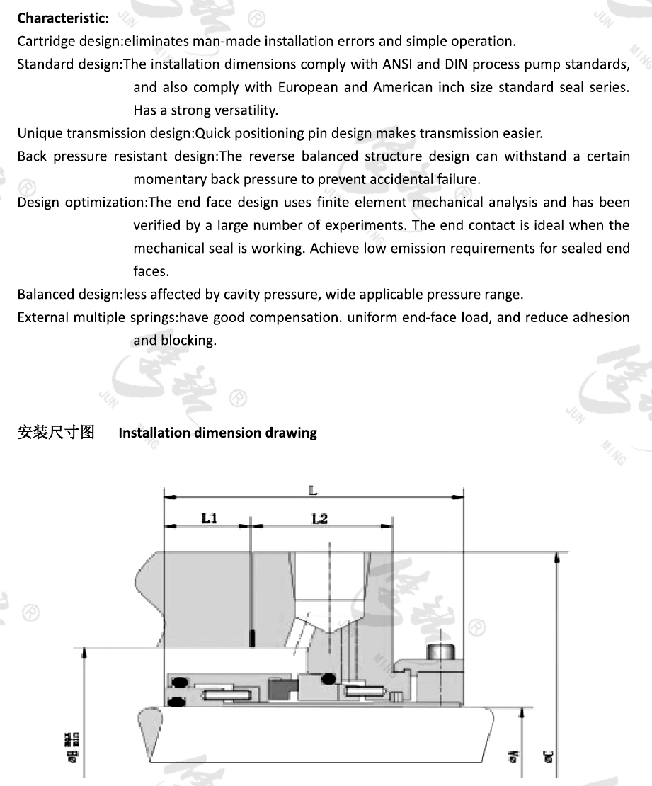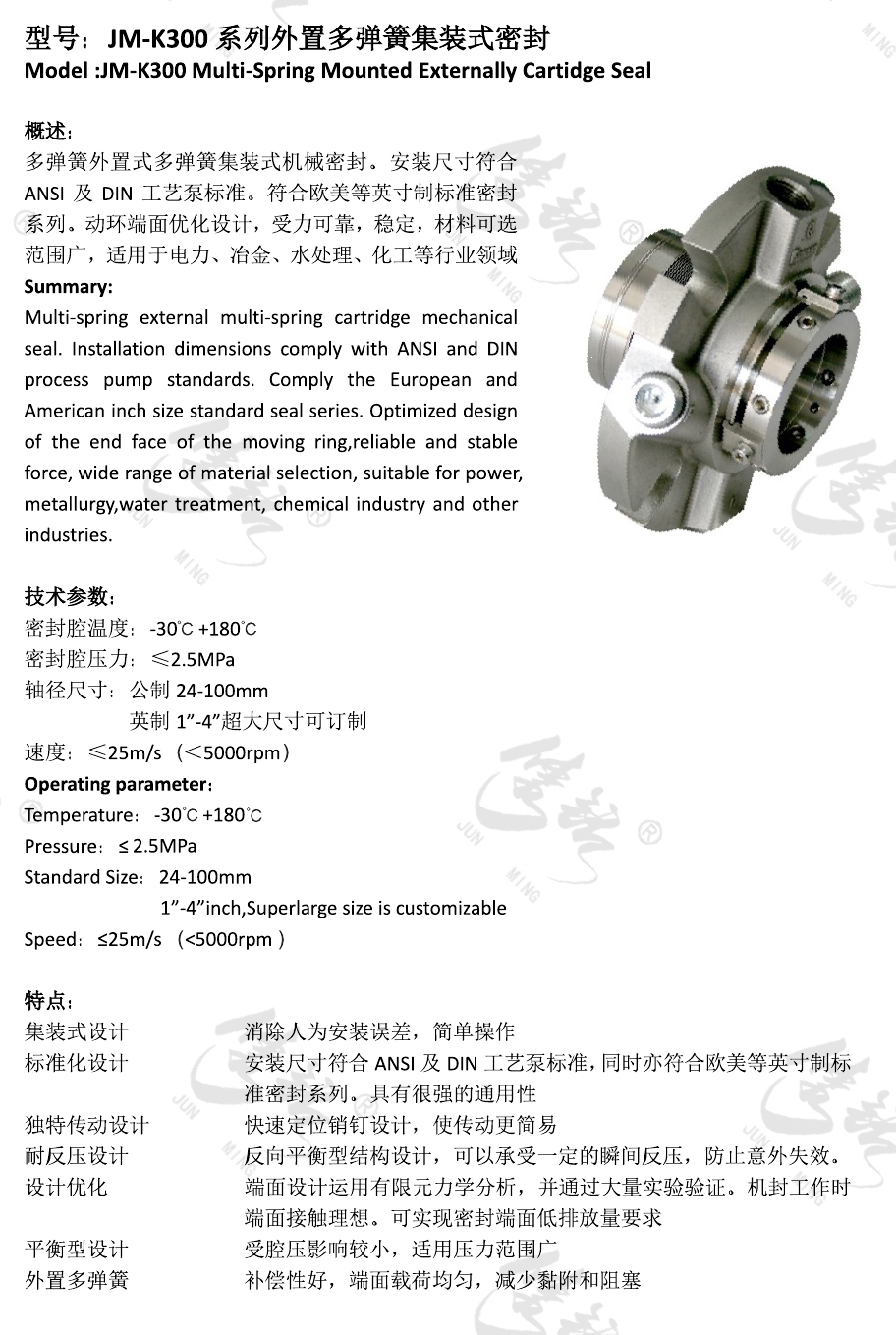 多彈簧外置式多彈簧集裝式機械密封。安裝尺寸符合ANSI及DIN工藝泵標(biāo)準。符合歐美等英寸制標(biāo)準密封系列。動環(huán)端面優(yōu)化設(shè)計,受力可靠,穩(wěn)定,材料可選范圍廣,適用于電力、冶金、水處理、化工等行業(yè)領(lǐng)域