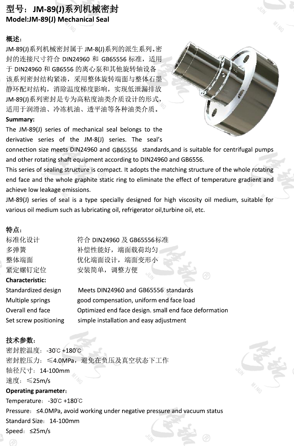 JM-89(J)系列密封是專為高粘度油類介質(zhì)設(shè)計的形式,適用于潤滑油、冷凍機(jī)油、透平油等各種油類介質(zhì)。