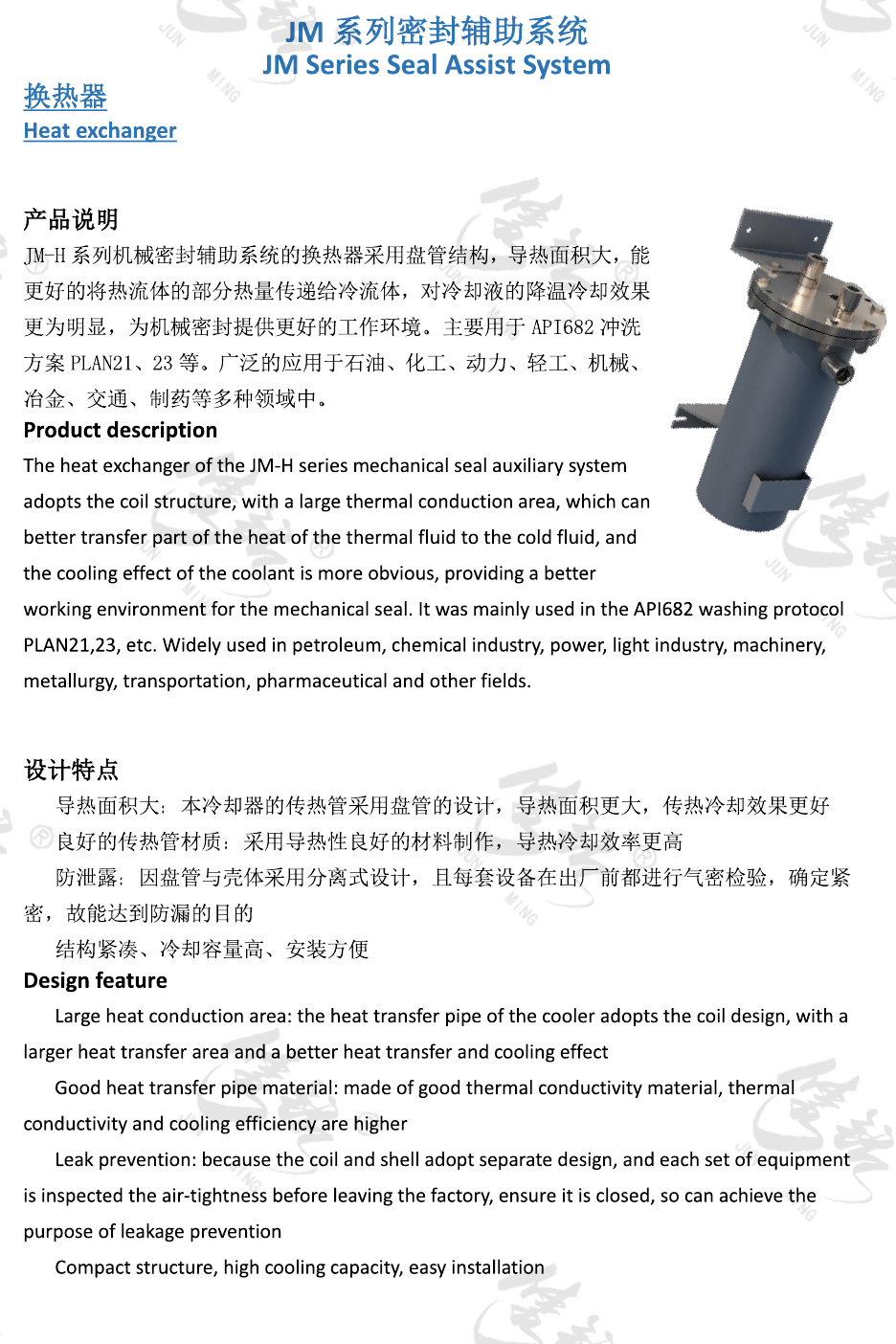 JM-H系列機械密封輔助系統(tǒng)的換熱器采用盤管結(jié)構(gòu),導熱面積大,能更好的將熱流體的部分熱量傳遞給冷流體,對冷卻液的降溫冷卻效果更為明顯,為機械密封提供更好的工作環(huán)境。主要用于API682沖洗方案PLAN21、23等。廣泛的應(yīng)用于石油、化工、動力、輕工、機械、冶金、交通、制藥等多種領(lǐng)域中。